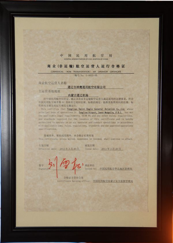 2013年3月28日,通遼神鷹通用航空有限公司CCAR-91部運(yùn)行合格審定頒證儀式在神鷹通航召開(kāi)。神鷹通航孫學(xué)慧副總經(jīng)理主持了本次會(huì)議,內(nèi)蒙古監(jiān)管局副局長(zhǎng)李陸康向通遼神鷹通用航空公司頒發(fā)了《商業(yè)非運(yùn)輸航空運(yùn)營(yíng)人運(yùn)行合格證》, 內(nèi)蒙古機(jī)場(chǎng)集團(tuán)公司通遼分公司領(lǐng)導(dǎo)參加了頒獎(jiǎng)儀式。這是內(nèi)蒙古地區(qū)第三家獲得CCAR-91部運(yùn)行許可的通用航空公司,也彌補(bǔ)了內(nèi)蒙古中東部地區(qū)通航事業(yè)的空白。